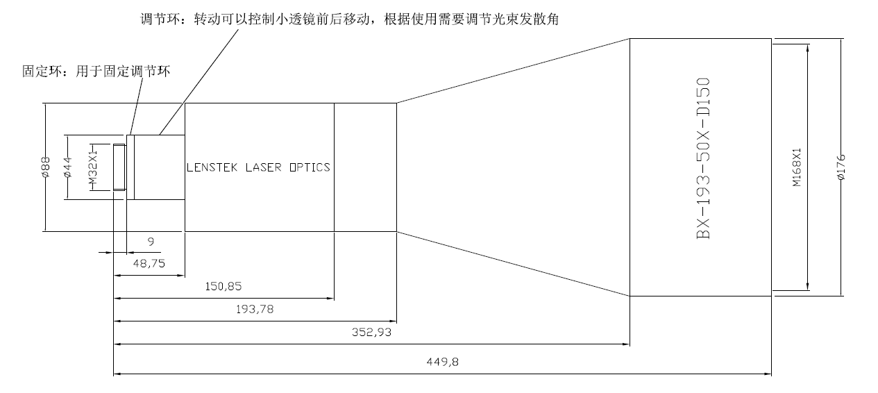 可调式紫外激光扩束镜,工作波长193nm,倍率50倍,最大150mm出光口径