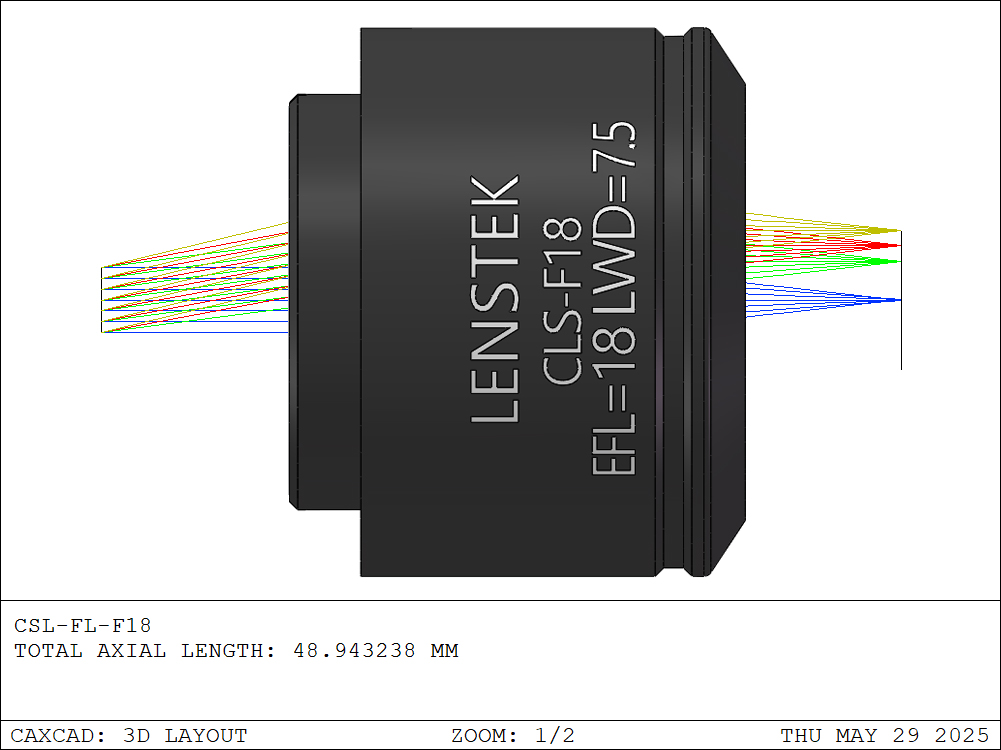 在机械接口方面,CLS-F18-BB 配备M25×0.75外螺纹,可通过SM1A12或RMSA2等标准转接环兼容SM1(1.035″-40)或RMS(0.800″-36)螺纹接口,安装灵活,适配性强。对于需要色散补偿的成像系统(如OCT或多光子显微镜),该透镜可与对应波段的专用色散补偿器配合使用,进一步提升轴向分辨率与成像对比度。总体而言,CLS-F18-BB 是一支兼顾大视场、高透过率与深层成像能力的扫描透镜,是近红外短波段激光扫描成像系统的理想选择。